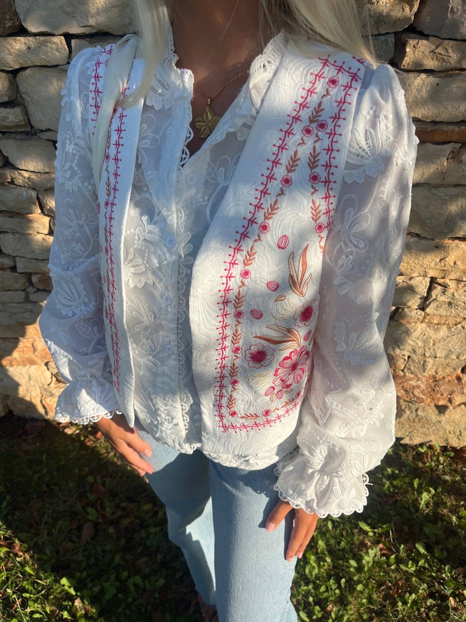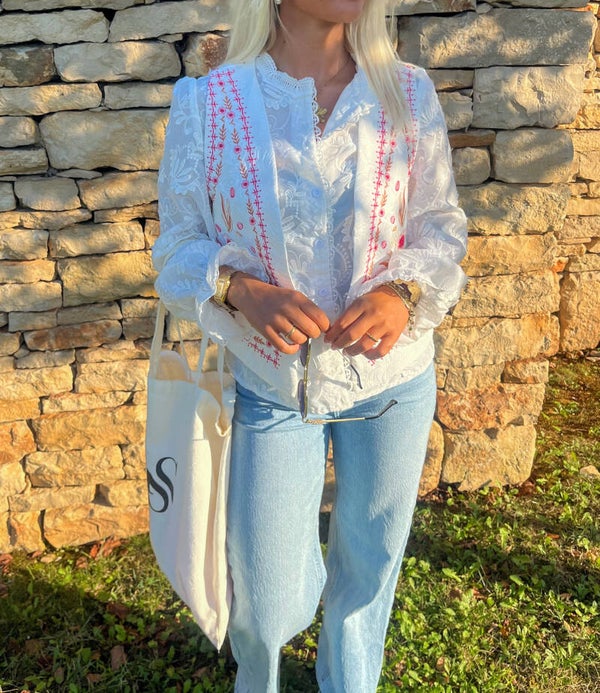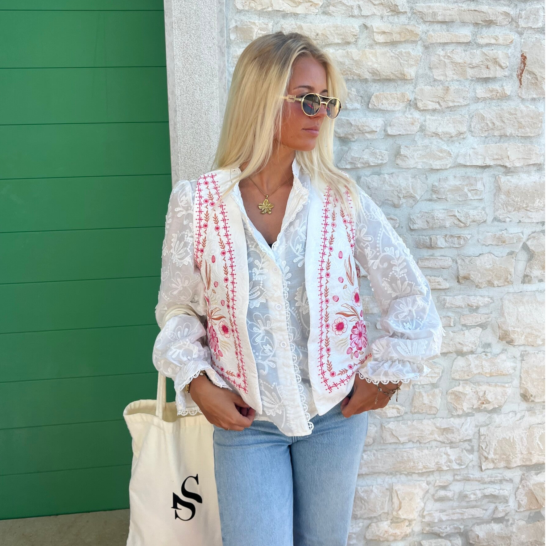 Met dit geborduurde gilet maak je van elke outfit iets bijzonders. De rode en roze borduursels springen eruit en geven direct karakter. Combineer over een blouse, jurk of basic top en je hebt meteen een unieke look.